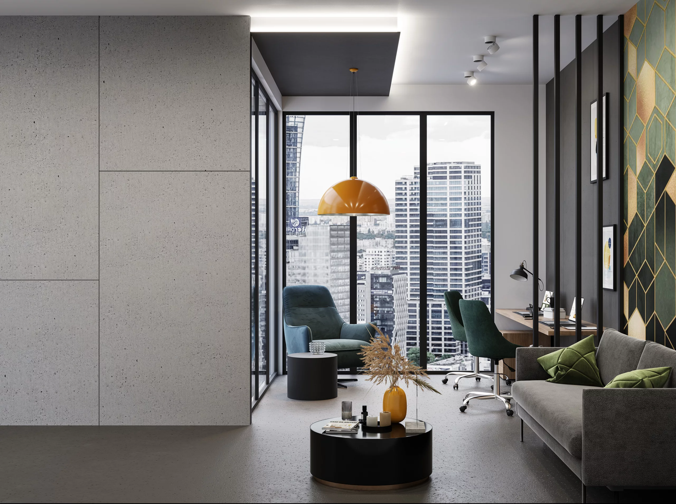 Architektonischer Beton ist eine geeignete Kulisse für farbenfrohe Arrangements, kann aber auch ein Interieur sanft beruhigen, in dem kräftige Farben dominieren. Zu Betonwänden passen Möbel in verschiedenen Stilen und aus verschiedenen Materialien, von Holz über Glas bis hin zu Kunststoff. Gestalten Sie den Raum nach Ihrem eigenen Geschmack.