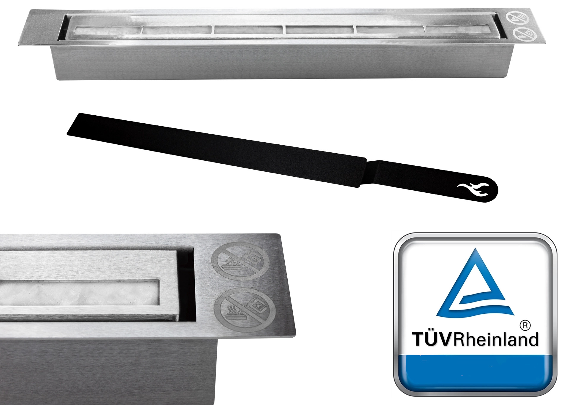 Unsere Einbau-Bio-Kamine verfügen über einen Brenner mit TÜV-Sicherheitszertifikat, ausgestellt von dem renommierten Labor TÜV Rheinland, das die Sicherheitsaspekte unserer Produkte prüft. Der Brenner besitzt zudem einen doppelt verarbeiteten Boden und eine Absorptionsmatte, die vor unerwünschtem Auslaufen von Bioethanol schützt.