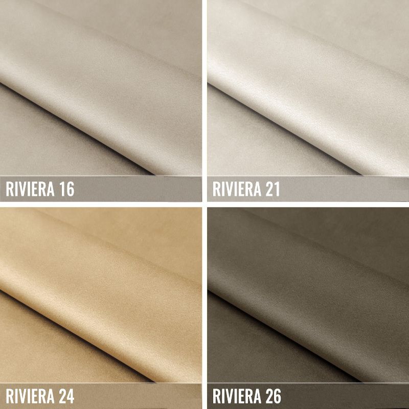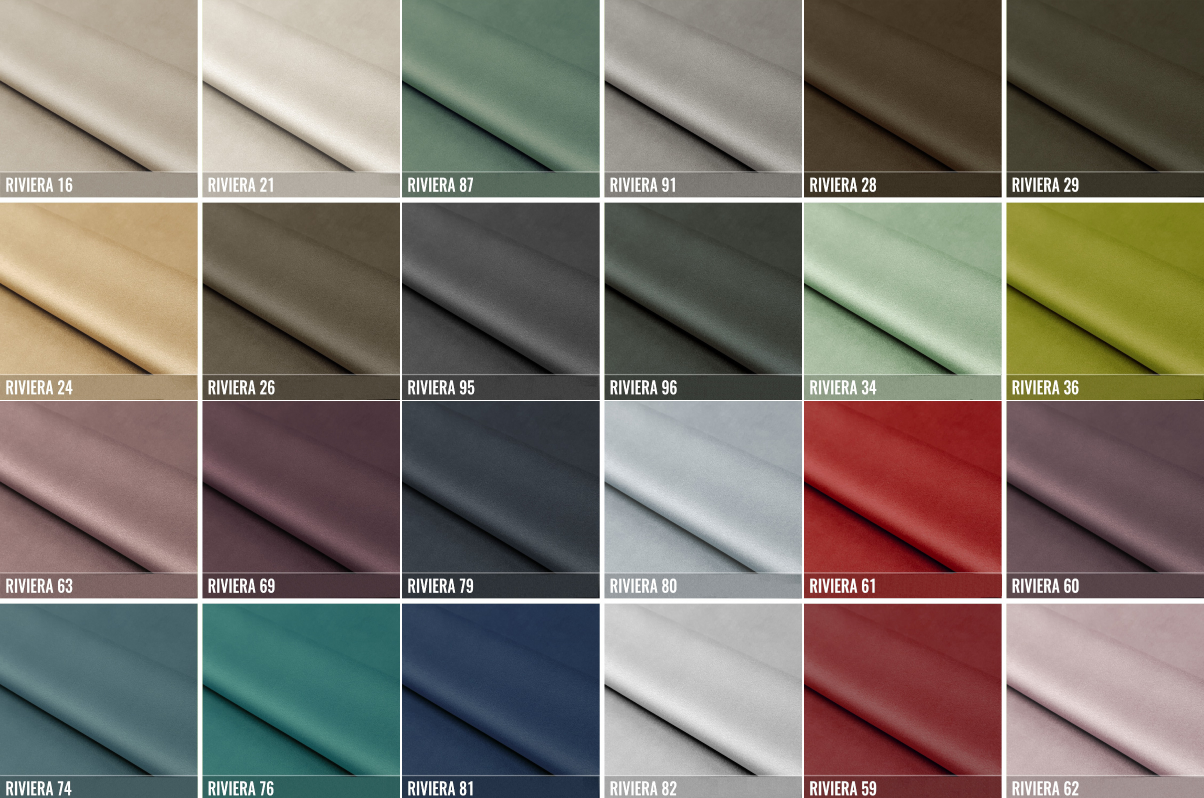 RIVIERA ist eines der derzeit beliebtesten Velvet-Soft-Touch-Gewebe. Es ist superweich und angenehm im Griff, die Oberfläche hat einen sehr subtilen Glanz, ist leicht glatt und zeigt minimale Schattierungen nach dem Reiben mit der Hand. In Bezug auf die Anwendung ist der Stoff RIVIERA ideal für Vorhänge – er ist auf beiden Seiten in derselben Farbe und fällt schön. Er eignet sich auch gut für Projekte mit Polstermöbeln, wo er ebenfalls häufig verwendet wird. Der Stoff hat das OEKO-TEX-Zertifikat.