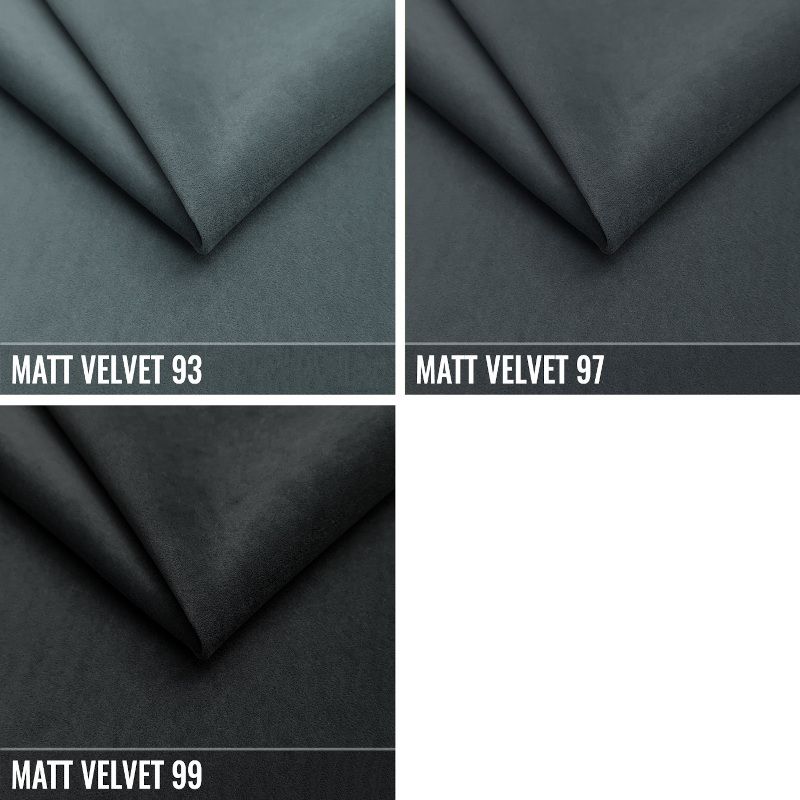 POLSTERSTOFF: Dickes und samtiges Velours mit einem hohen Gewicht von 430 g/m2. Matt Velvet gehört zu den wenigen matten und nicht schattierten Veloursstoffen (die Textur minimiert das Schattenwerfen und reduziert deutlich das Hinterlassen von Streifen beim Überstreichen mit der Hand), es hat auch eine hohe Beständigkeit gegen Fusselbildung. Die matten Farben und die Flauschigkeit des Stoffes machen ihn vielseitig einsetzbar und eignen sich für viele Einrichtungen. Er hat auch eine hohe Abriebfestigkeit und Eigenschaften, die das Eindringen von Flüssigkeiten erschweren. Von der Oberfläche des Matt Velvet kann man leicht verschiedene Verschmutzungen entfernen, einschließlich Kugelschreiber oder verschüttetem Wein.