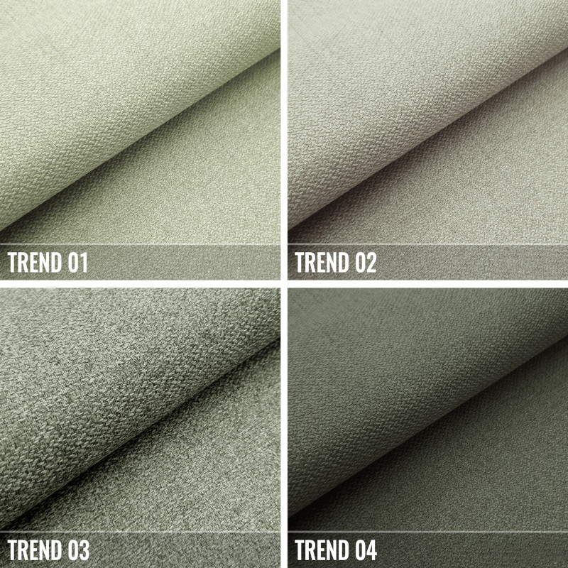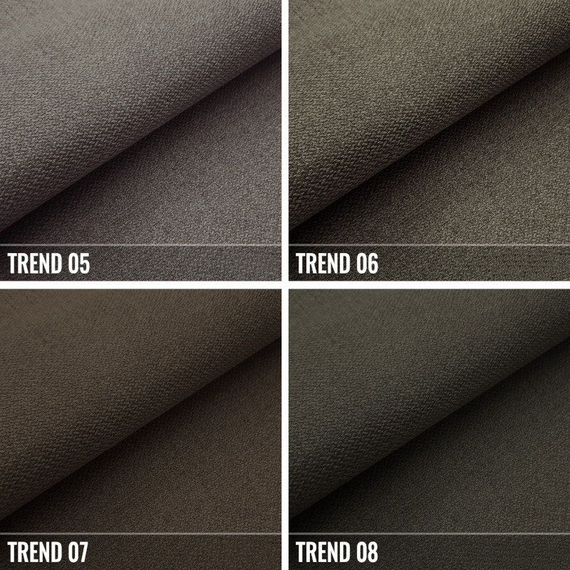 POLSTERSTOFF: Gewebe mit feiner Webart und zart spürbarer Textur im Griff. Perfekt weich und angenehm anzufassen. In der TREND-Kollektion wird eine universelle und dezente Farbpalette verwendet. Sie lässt sich gut zu allem kombinieren, dank der breiten Palette von Farben – von beige-braunen, traditionellen grauen Tönen bis zu lebhaften, betonten Farbtönen. Es eignet sich ideal für klassische und moderne Innenraumgestaltungen. Es erfreut sich aufgrund seiner Elastizität und Widerstandsfähigkeit großer Beliebtheit. Am wichtigsten ist, es neigt nicht zum Verfilzen!