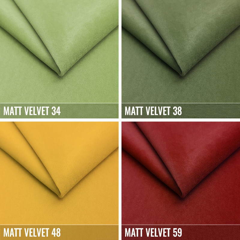 POLSTERSTOFF: Dickes und samtiges Velours mit einem hohen Gewicht von 430 g/m2. Matt Velvet gehört zu den wenigen matten und nicht schattierten Veloursstoffen (die Textur minimiert das Schattenwerfen und reduziert deutlich das Hinterlassen von Streifen beim Überstreichen mit der Hand), es hat auch eine hohe Beständigkeit gegen Fusselbildung. Die matten Farben und die Flauschigkeit des Stoffes machen ihn vielseitig einsetzbar und eignen sich für viele Einrichtungen. Er hat auch eine hohe Abriebfestigkeit und Eigenschaften, die das Eindringen von Flüssigkeiten erschweren. Von der Oberfläche des Matt Velvet kann man leicht verschiedene Verschmutzungen entfernen, einschließlich Kugelschreiber oder verschüttetem Wein.