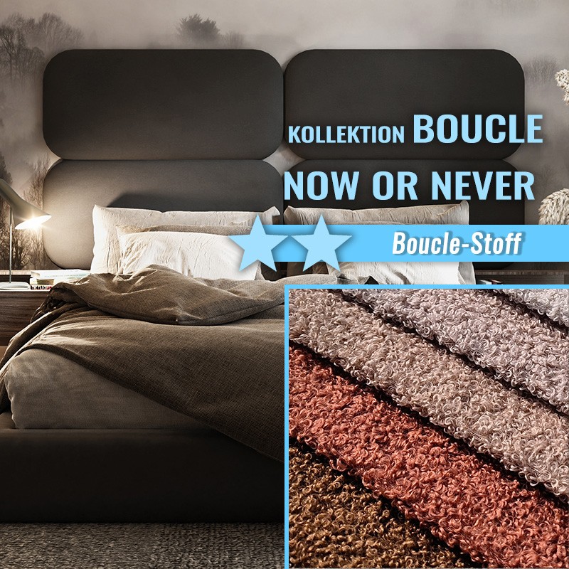 POLSTERSTOFF: „NOW OR NEVER“ ist ein Bouclé-Stoff, der aus dekorativ verdrehtem Garn mit Schlaufen, Knoten und Schleifen gefertigt ist. Er ist elegant und zugleich modern, dabei äußerst angenehm im Griff und sehr strapazierfähig. Der Stoff ist in einer klassischen Farbpalette mit einem sanften Glanz erhältlich, der die unregelmäßige und vielschichtige Textur perfekt betont.