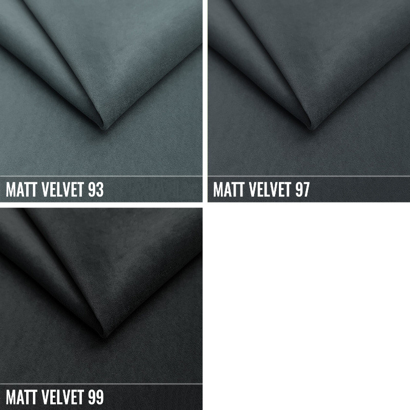 POLSTERSTOFF: Dickes und samtiges Velours mit einem hohen Gewicht von 430 g/m2. Matt Velvet gehört zu den wenigen matten und nicht schattierten Veloursstoffen (die Textur minimiert das Schattenwerfen und reduziert deutlich das Hinterlassen von Streifen beim Überstreichen mit der Hand), es hat auch eine hohe Beständigkeit gegen Fusselbildung. Die matten Farben und die Flauschigkeit des Stoffes machen ihn vielseitig einsetzbar und eignen sich für viele Einrichtungen. Er hat auch eine hohe Abriebfestigkeit und Eigenschaften, die das Eindringen von Flüssigkeiten erschweren. Von der Oberfläche des Matt Velvet kann man leicht verschiedene Verschmutzungen entfernen, einschließlich Kugelschreiber oder verschüttetem Wein.